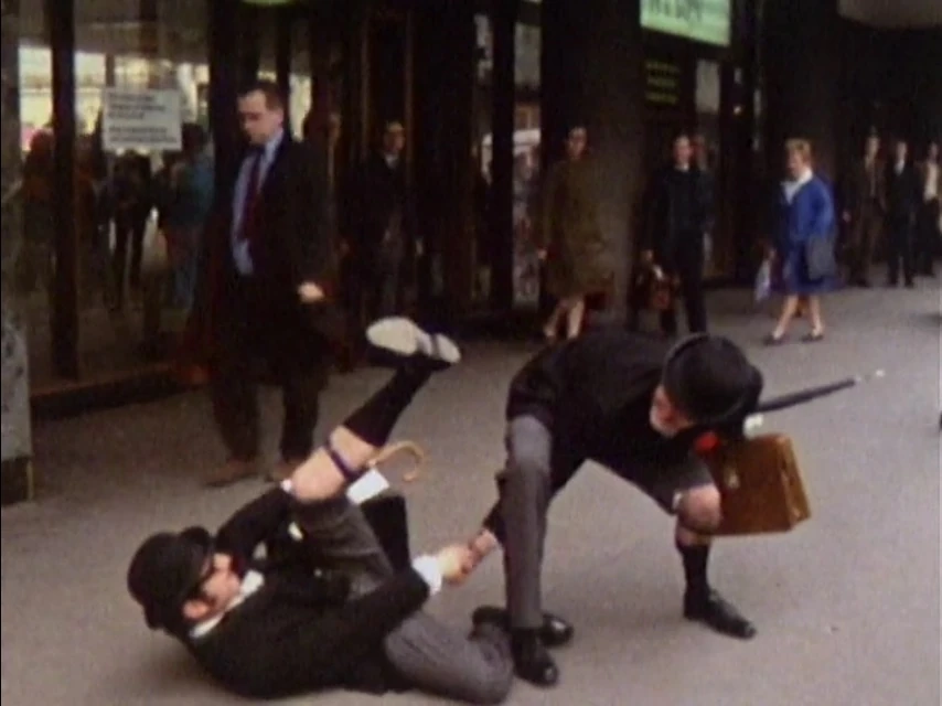 A voiceover (Eric Idle) looks at the handshake between the city gent (Terry Jones) and Mr Leavey (Idle) in slow motion, and the actors perform the handshake again but slower. In response to the question 'what other ways are there of recognising a free mason?' it cuts to five city gents hopping along a busy street with their trousers at their ankles. Two masons (Jones and John Cleese) with one trouser leg rolled up greet each other by shaking hands through each other's legs. Another mason (Graham Chapman) half naked wearing fake antlers and sash saying 'I'M A MASON' stands at a bus stop.