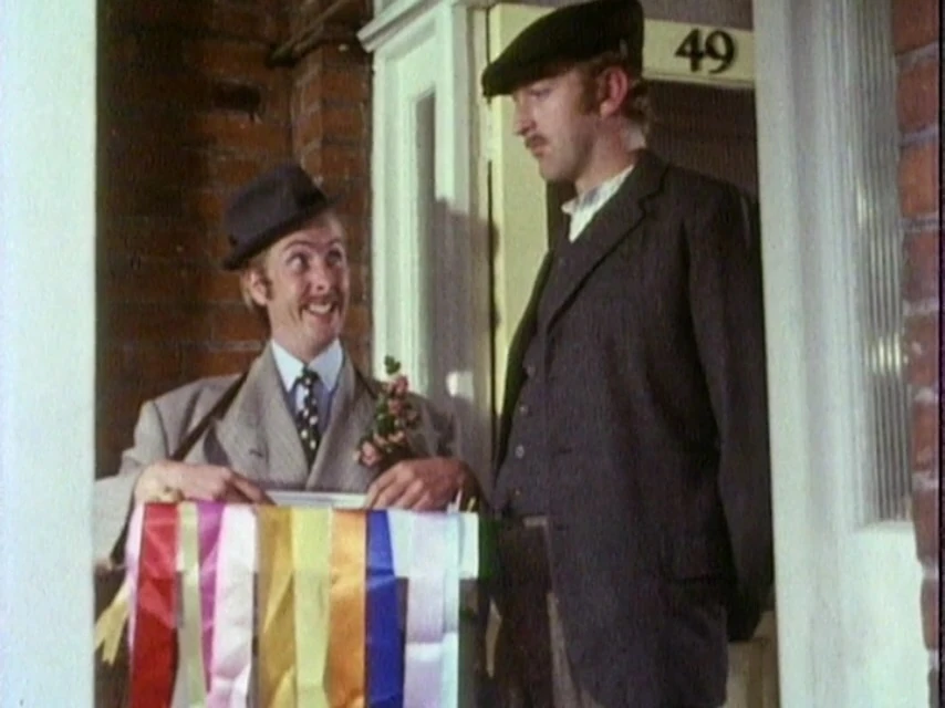 From the previous sketch, Reg (Graham Chapman) answers the door. A man from the BBC (John Cleese) asks him to come with them to answer a door in a sketch they are filming. Reg agrees, and they walk to the van.. It drives away to the filming location.