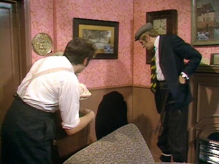 Just then, a group of cricketers enter and asks if the third test in here and Mr Concrete sends them out, saying it was a joke. The ratcatcher announces he's going in the wainscotting and the same Wains Cotting lady rushes out of her house and says "they said it again!"