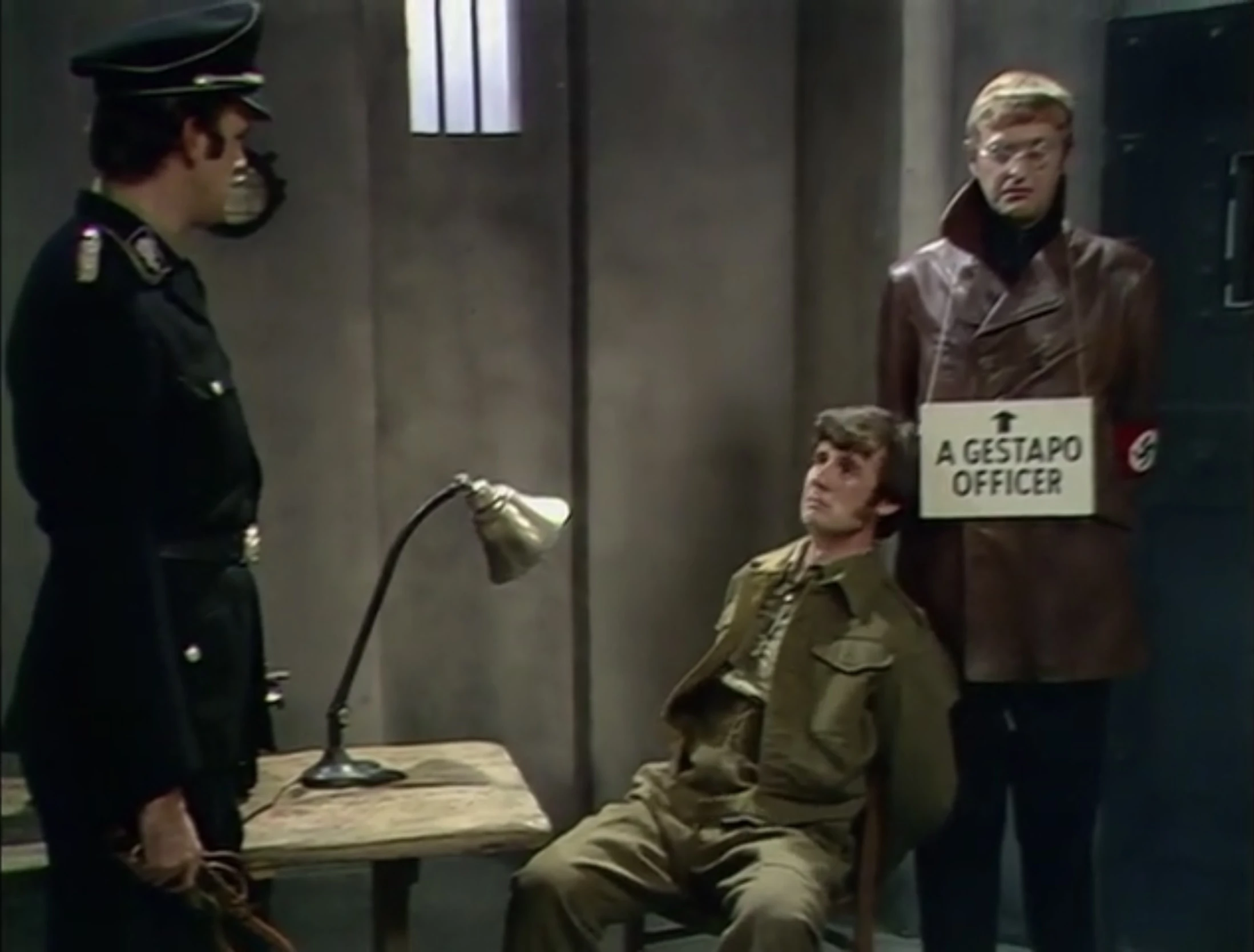 A British soldier (Palin) is captured and forced to tell the joke to the Germans. However, as hearing the joke proves deadly, his captors (John Cleese and Chapman) die laughing and he escapes. The Germans work to produce an equally deadly joke; two Gestapo officers in charge of the "killer joke" effort (Chapman and Terry Jones) are seen shooting scientists who bring in jokes that aren't funny.